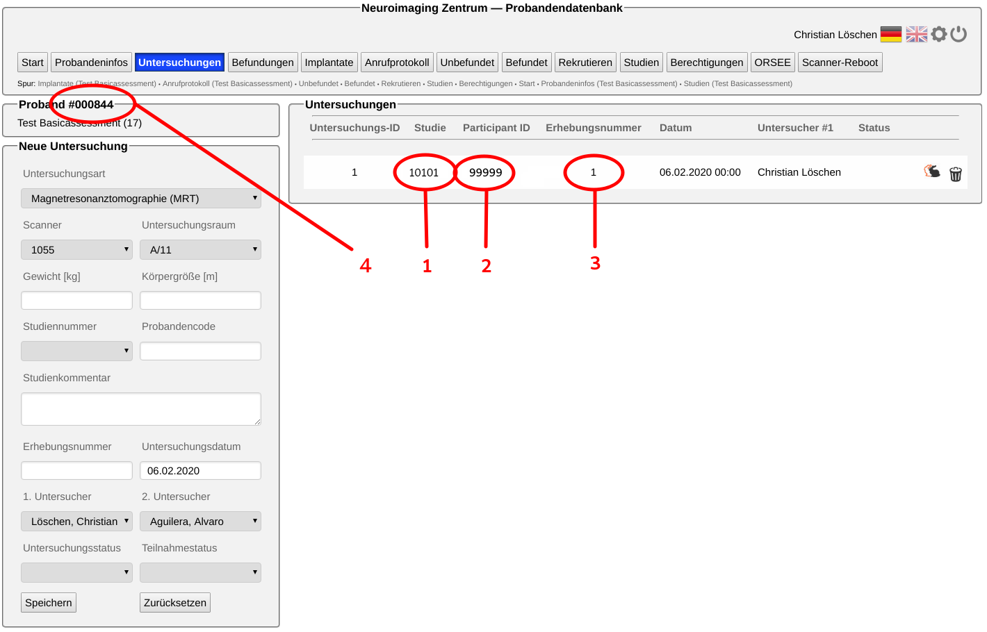 Die einzugebenden Studiendaten 1 - 4 können der PaMS entnommen werden. Dazu wird für den Probanden eine neue Untersuchung angelegt. Auf der Seite der Untersuchung werden die notwendigen Informationen angezeigt. (siehe Abb. 2)